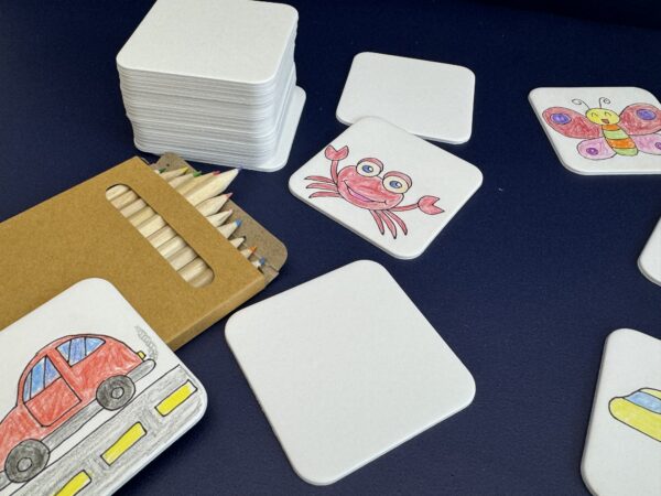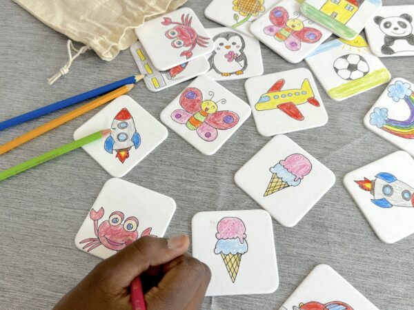 Die Memory’s werden inkl. einer Packung Buntstifte verschickt.