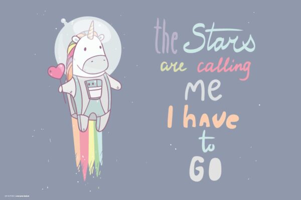 Unicorn goes space! Originelle Schreibtischunterlage mit Einhorn als Astronaut im Weltall und bunter Textgrafik “The Stars are calling me, I have to go”. 100 % Erfolgsgarantie beim Nachwuchs!