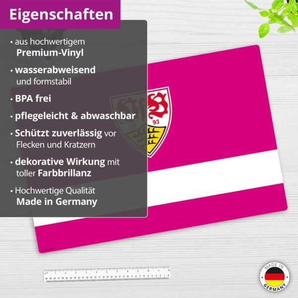 Mit dieser hochwertigen Schreibtischunterlage bringst Du den VfB Stuttgart direkt an Deinen Arbeitsplatz oder ins Kinderzimmer. Als Fanartikel überzeugt die Unterlage mit Vereinslogo und Farben – ein Muss für echte VfB-Fans. Gefertigt aus strapazierfähigem Vinyl schützt die Schreibunterlage Tische zuverlässig vor Kratzern, Flecken und Abnutzung. Die Oberfläche ist pflegeleicht & abwaschbar, sodass kleine Missgeschicke (z. B. Stifte, Getränke) schnell entfernt werden können.