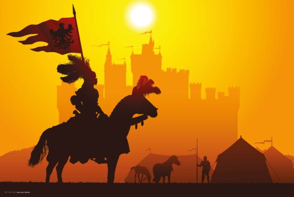 Ein tapferer Ritter auf seinem Pferd, umgeben von goldenem Licht und einem Himmel in warmen Farben: Dieses beeindruckende Motiv entführt dich in eine Welt voller Abenteuer, Ehre und Fantasie. Der Sonnenuntergang taucht die Szene in eine magische Stimmung – perfekt für kleine und große Mittelalterfans.
