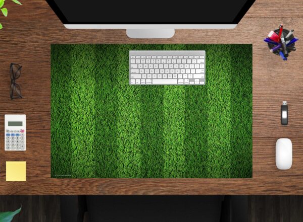 Mit dieser Schreibtischunterlage holst du dir das Stadion-Feeling direkt nach Hause! Der saftig grüne Spielfeldrasen ist die perfekte Unterlage für kleine und große Fußballfans, die auch am Schreibtisch in Bewegung bleiben wollen.