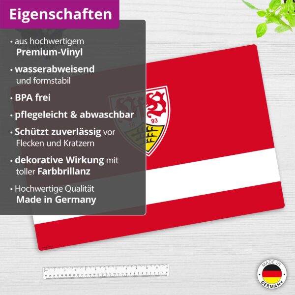 Mit dieser hochwertigen Schreibtischunterlage bringst Du den VfB Stuttgart direkt an Deinen Arbeitsplatz oder ins Kinderzimmer. Als Fanartikel überzeugt die Unterlage mit Vereinslogo und Farben – ein Muss für echte VfB-Fans. Gefertigt aus strapazierfähigem Vinyl schützt die Schreibunterlage Tische zuverlässig vor Kratzern, Flecken und Abnutzung. Die Oberfläche ist pflegeleicht & abwaschbar, sodass kleine Missgeschicke (z. B. Stifte, Getränke) schnell entfernt werden können.