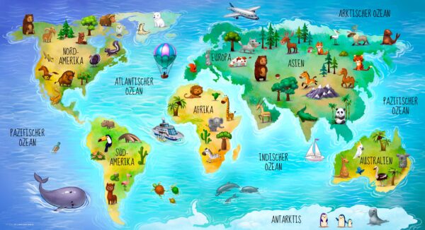 Weltkarte in deutsch mit vielen Tieren – Schreibtischunterlage 74 x 40