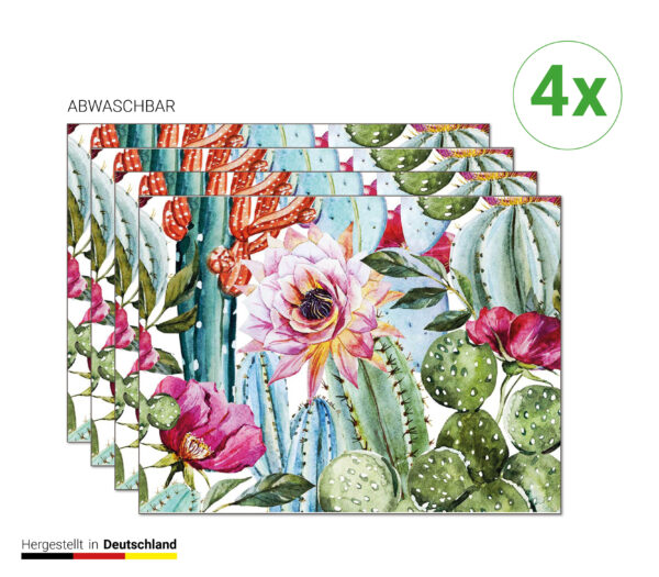 Tropische Blüten mit Kakteen – Tischsets | Platzsets aus Premium-Vinyl 40 x 30 cm – 4 Stück